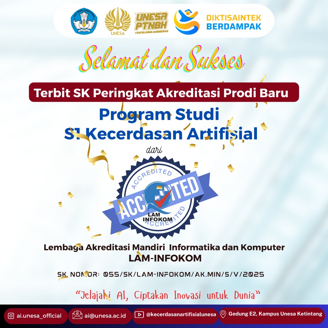 Dengan rasa syukur yang mendalam, kami informasikan akreditasi resmi pertama untuk Program Studi S1 Kecerdasan Artifisial Universitas Negeri Surabaya oleh LAM INFOKOM.Sebagai program studi yang baru berdiri, pencapaian ini menjadi tonggak p